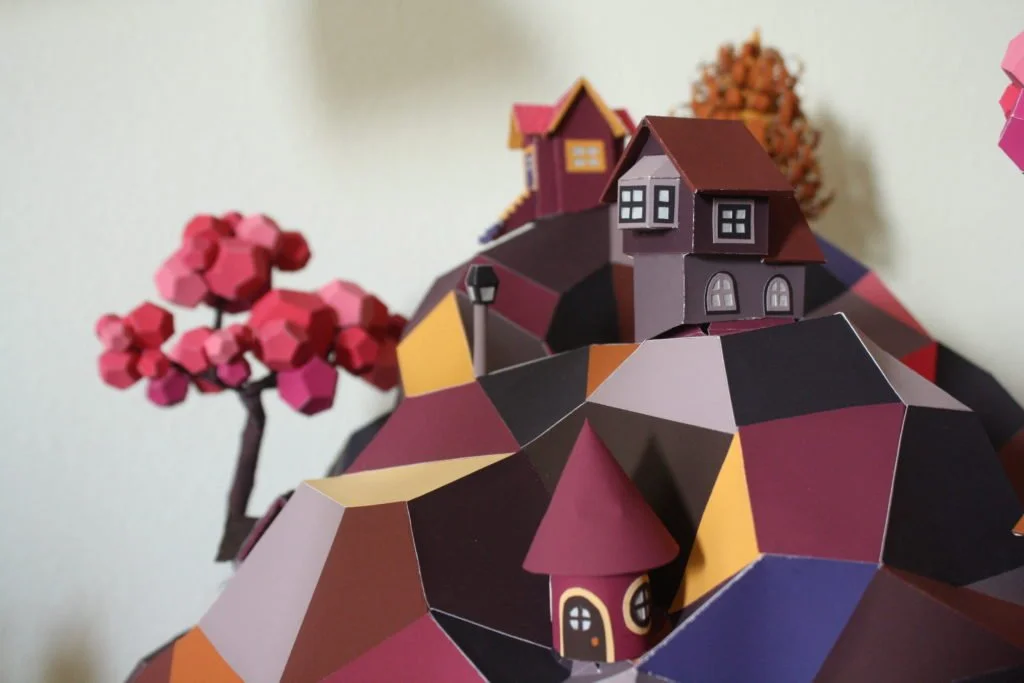 My piece for the original show, Unnatural Habitats, is called “Paperville.” It’s a tiny mountain town with low-poly trees and glowing houses made mostly of paper and some wire for structure. My Adaptation piece is called “Slice of Paperville.” (Much better to hang on a wall, haha.)